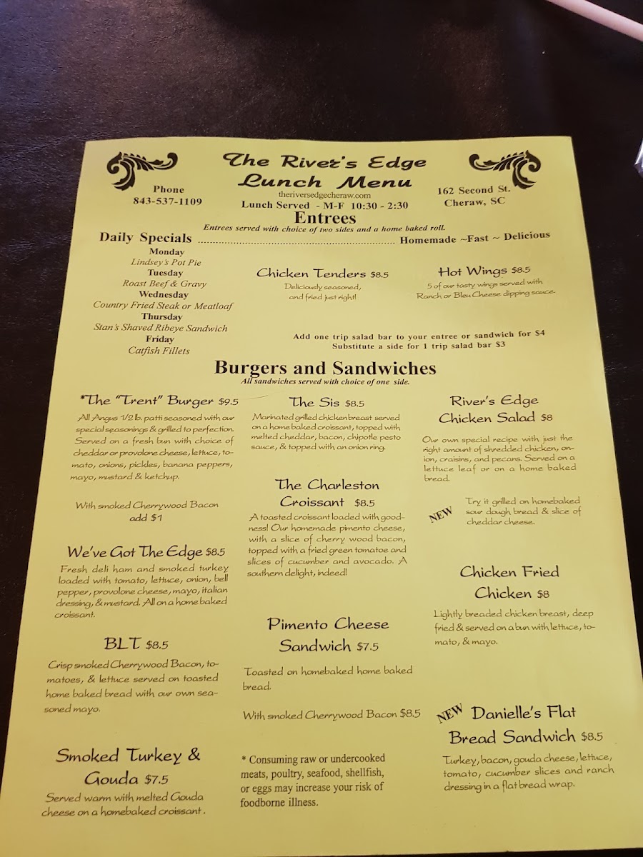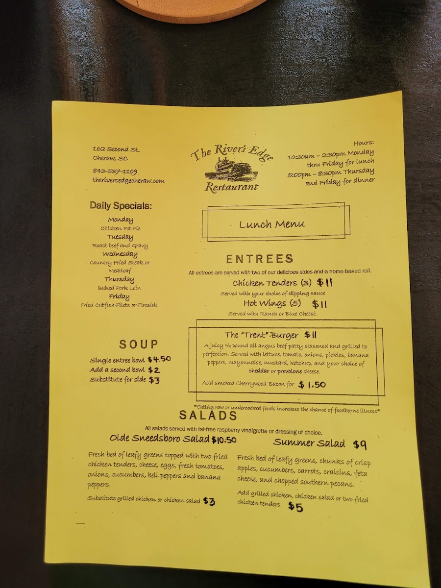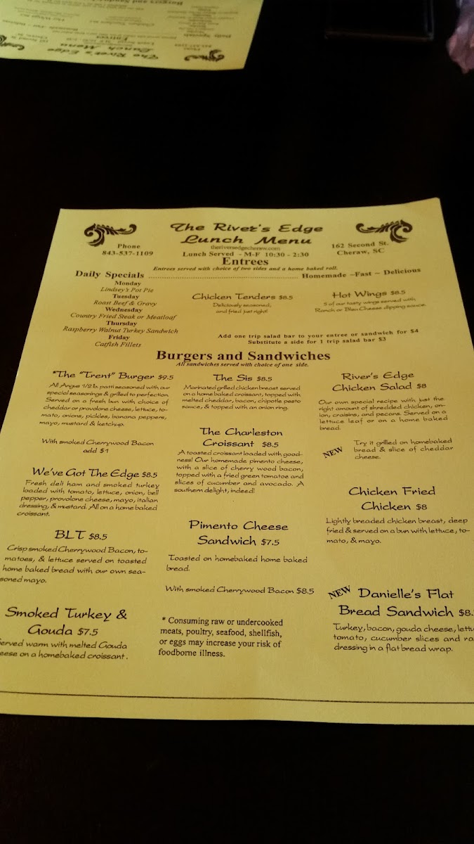 At River's Edge, located at 162 2nd St, Cheraw, SC, the menu offers a wide array of dishes that cater to a variety of tastes, with daily specials and a comfortable selection of burgers, sandwiches, and sides. One of the highlights is their Lindsey's Pot Pie, which is a delicious option available as part of their daily specials. For those looking for a heartier option, the Country Fried Steak or Meatloaf served on Wednesdays offer classic comfort food with a homey touch. On Fridays, guests can enjoy the flavorful Catfish Fillets, a favorite among seafood lovers.